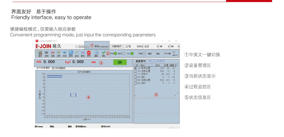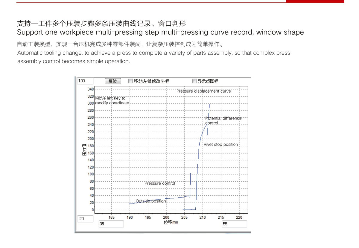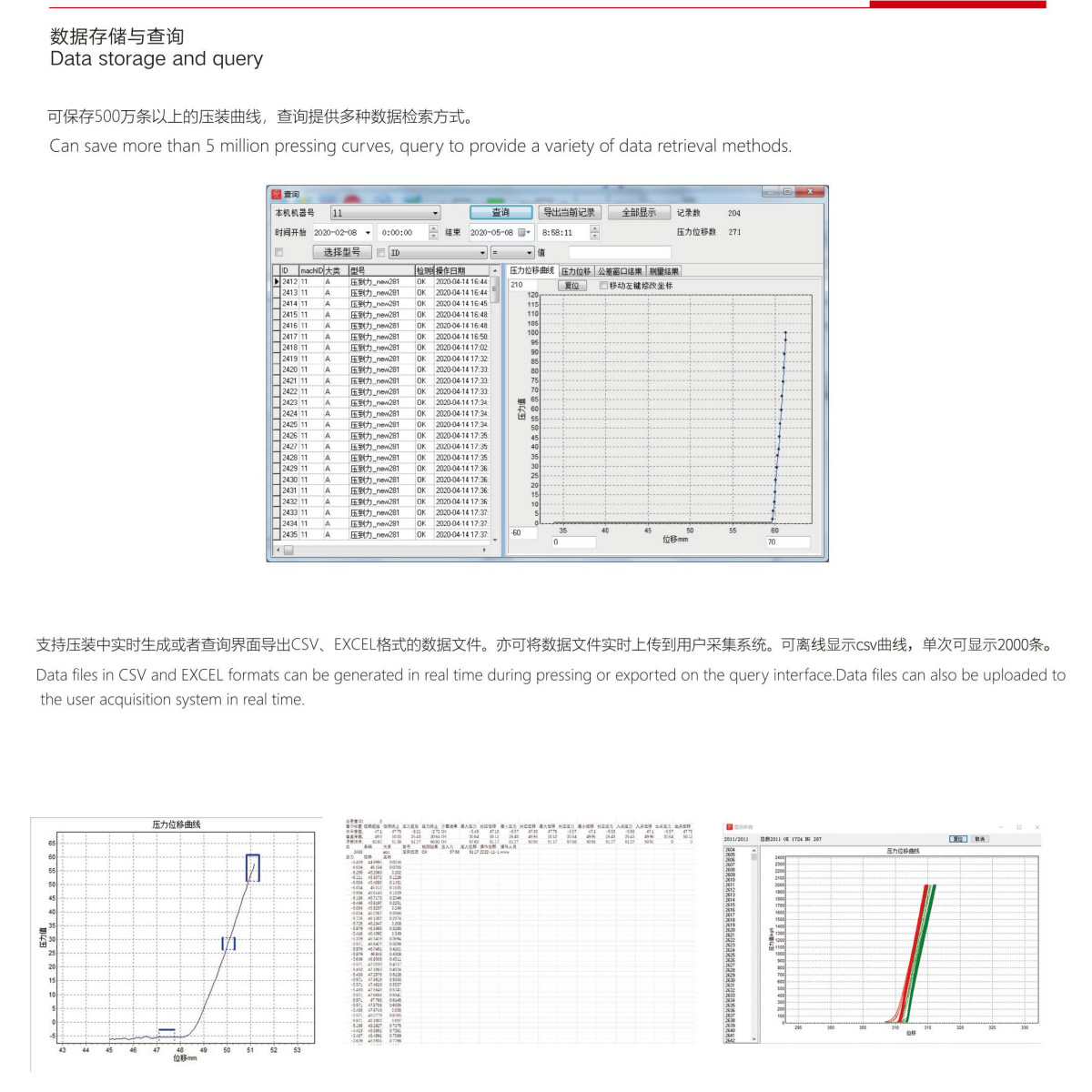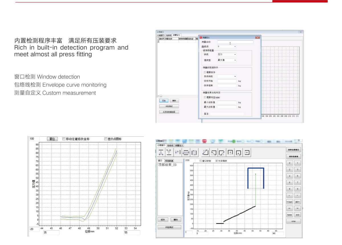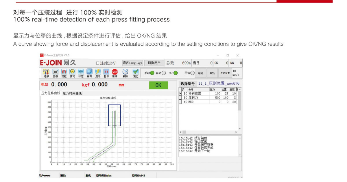 軟件基于 windows 平臺,實(shí)現(xiàn)壓裝工藝流程編制,壓力位移曲線、壓力時間曲線實(shí)時顯示,一個工件多個壓裝步驟、多條壓裝曲線同時顯示。支持判斷窗口、包絡(luò)線、測量等評估功能,輸出 OKING 結(jié)果,用戶等級化管理可以設(shè)置不同權(quán)限,壓裝歷史記錄、操作日志、報警日志方便查詢。E-Press 工業(yè)軟件支持 MS SQL、ACCeSS 等主流數(shù)據(jù)庫格式。